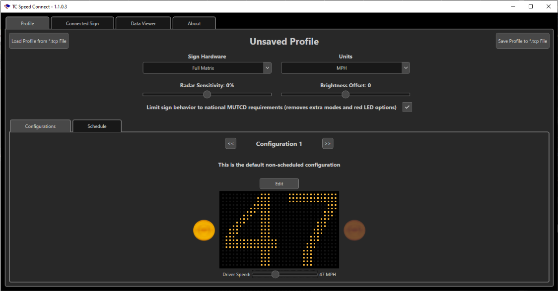 Configuration settings can be adjusted offline. Navigate to the configuration settings to adjust speed limits, sensitivity, and other operational parameters. Use the profile setup to create and manage sign profiles including configurations, day-plans, and schedules. Once configured, connect to the sign and upload the profile using the 'Upload to Sign' function.
