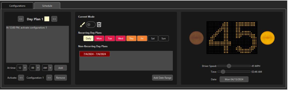 Schedules are set up with the assignment of day plans to a hierarchy mirroring the logic executed on the sign. A preview is included so you can test what you’ve set.