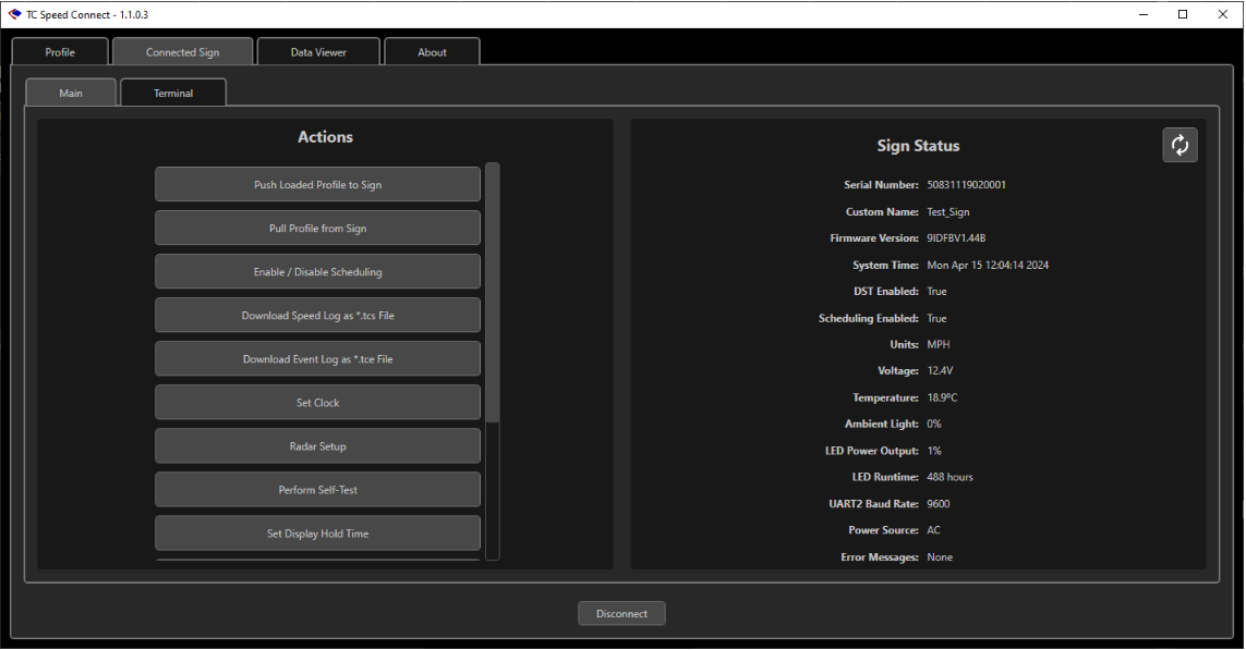 You can connect to the radar speed sign either via Bluetooth or using a hard-wired RS232 serial connection. On the 'Connected Sign' page within the software, it will display a list of signs within Bluetooth range or connected via serial port. Select your sign and use the provided credentials to log in.