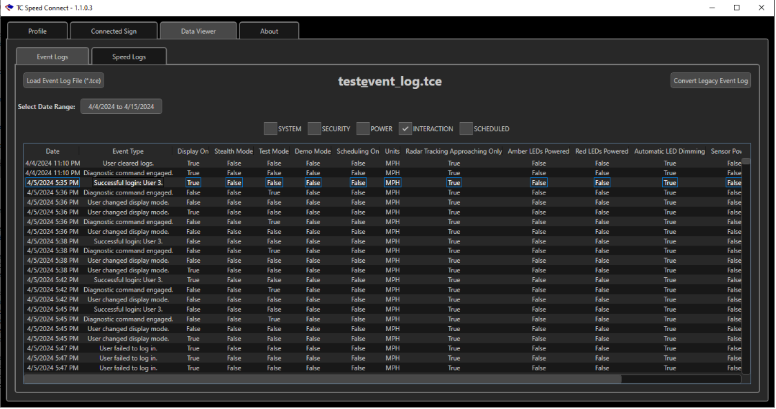 • Legacy event logs (usually saved as *.csv) can be converted to the .tce format via the ‘Convert Legacy Event Log’ button in the top right.