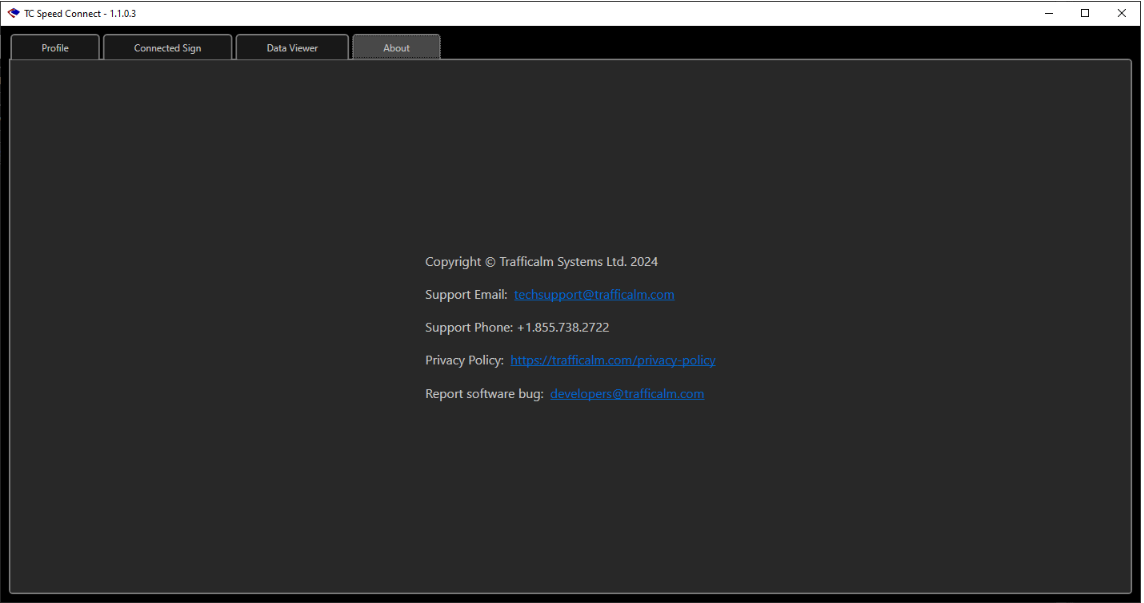 Legacy TC Speed Connect software: Configure radar signs, manage profiles, connect via Bluetooth, analyze performance logs