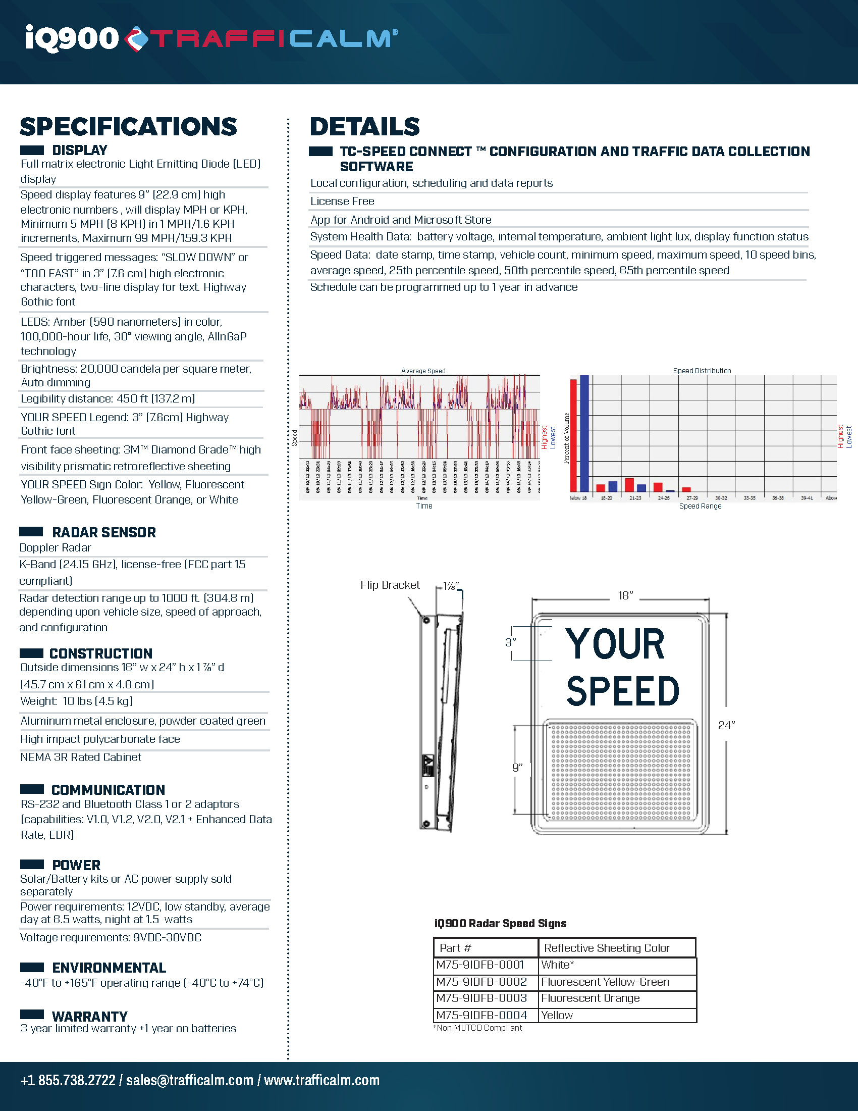 The iQ900 features bright 9″ (22.9 cm) characters that can be seen from up to 450 ft (137.2 m) away. This unit includes a full-matrix display allowing speed numbers and custom messages like “SLOW DOWN” or “TOO FAST”. Enhanced data collection, Bluetooth/RS-232 communication, and branded software are built-in, making it ideal for high-visibility or data-driven deployments.
