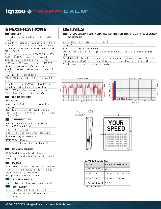 The iQ1200 features bright 12″ (30.5 cm) LED characters that are legible from up to 600 ft (182.9 m). The full-matrix display allows both vehicle speed and custom messages such as “SLOW DOWN” or “TOO FAST,” making it ideal for high-visibility, data-driven installations and community speed-reduction programs.
