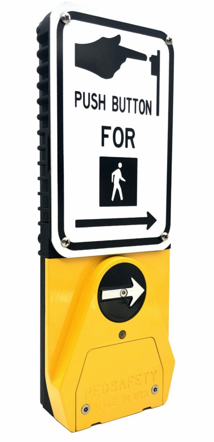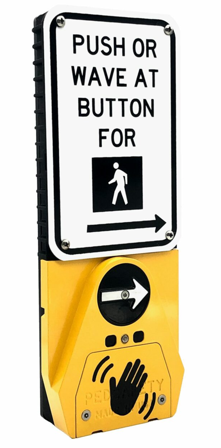 Guardian Accessible Pedestrian Signal: 12-24VDC operation, 100dB audio output, vibrotactile arrow, USB/Bluetooth config. Guardian Wave adds infrared hand-wave detection for touchless activation in outdoor environments.